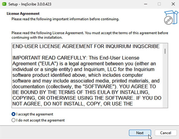 Simply follow the steps in the installer wizard. Review the agreement, select "I accept", and click Next.
