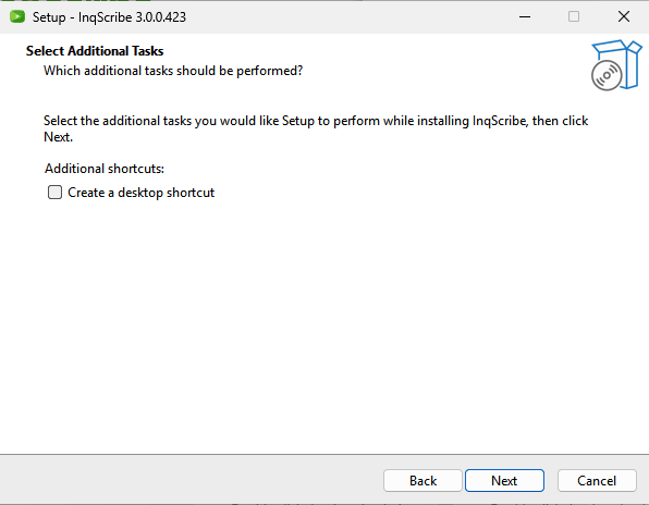 Optionally, create a desktop shortcut icon to easily start InqScribe. Click Next.