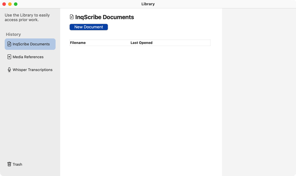 Use the library to quickly access your prior work. As you create documents, use media, and generate transcriptions, the library automatically creates a history of your resources.