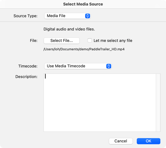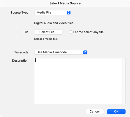 For now, ignore the Timecode and Description fields. You can read more about them on the Selecting Media Sources page.
