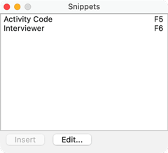 InqScribe provides two example snippets by default: Interviewer and Activity. Interviewer will insert the current timecode, followed by the text Interviewer: Snippets like this are extremely useful during transcription. Activity inserts a simple code that a researcher might use to denote a certain kind of activity. You can search for such codes later when reviewing the transcript, or import the text into another qualitative research package that can do more sophisticated analyses using such codes.