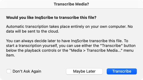 When InqScribe loads the media, if it detects that the media includes audio, it will show a dialog asking you whether you want to automatically transcribe the media.