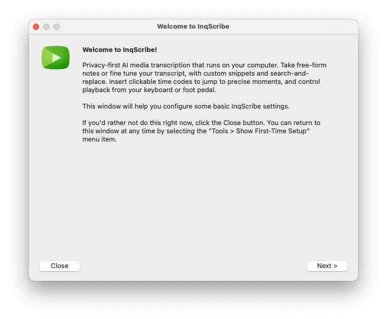 If this is the first time you've ever used InqScribe, the Welcome to InqScribe window will appear.
