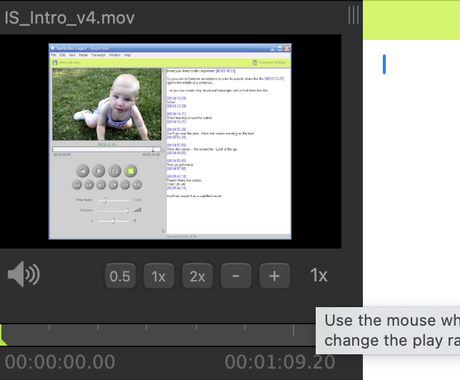 This is useful if you are transcribing and you need to slow down playback so that you can better understand what's being said, or so you can align your typing speed with the playback rate. Being able to control the playback rate makes transcription more efficient because you can transcribe longer sequences without having to pause the movie or back up and replay a section that went by too fast.